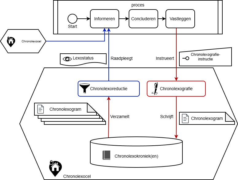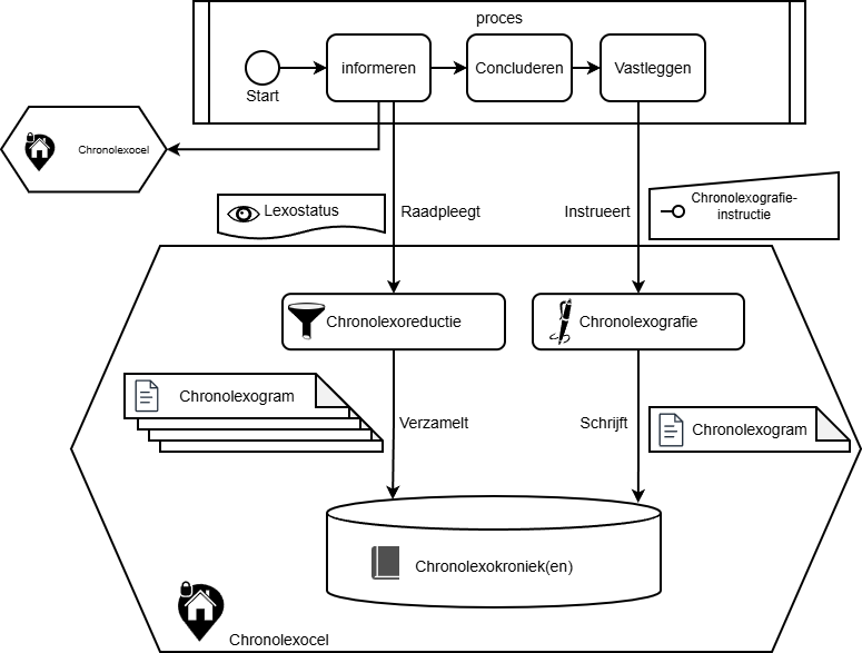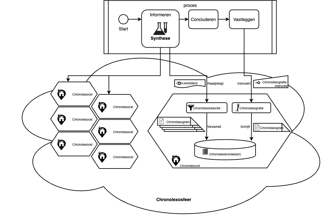 We kunnen nu de flow van een proces dat eerder vastgelegde gegevens gebruikt opnieuw bekijken en aanvullen tot een totaaloverzicht van de informatieflow. Vanuit het betreffende proces wordt in de stap informeren informatie opgehaald en met elkaar in verband gebracht door de synthese van meerdere lexostatussen, zeer waarschijnlijk uit meerdere cellen. Elke cel die bevraagd is heeft daartoe reductie toegepast om uit de eigen kronieken relevante chronolexogrammen te verzamelen en te verwerken tot een lexostatus die aan het aanroepende proces is teruggegeven. Vervolgens volgt in dat proces de stap concluderen waarin conclusies worden getrokken uit die informatie, en/of besluiten worden gemaakt die in de processtap vastleggen worden vastgelegd dmv chronolexografie in een specifieke cel. Binnen deze cel worden dan de juiste betreffende kronieken bijgewerkt. Dit geheel leidt tot het volgende overzicht: